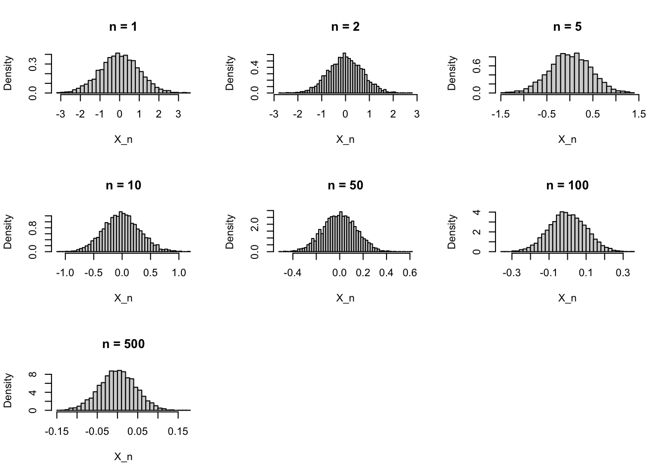 直感的には,\(n\) が大きくなるほど分布が 0 の近くに強く集中するので,\(X_n\) は 0 に近づくはずである。