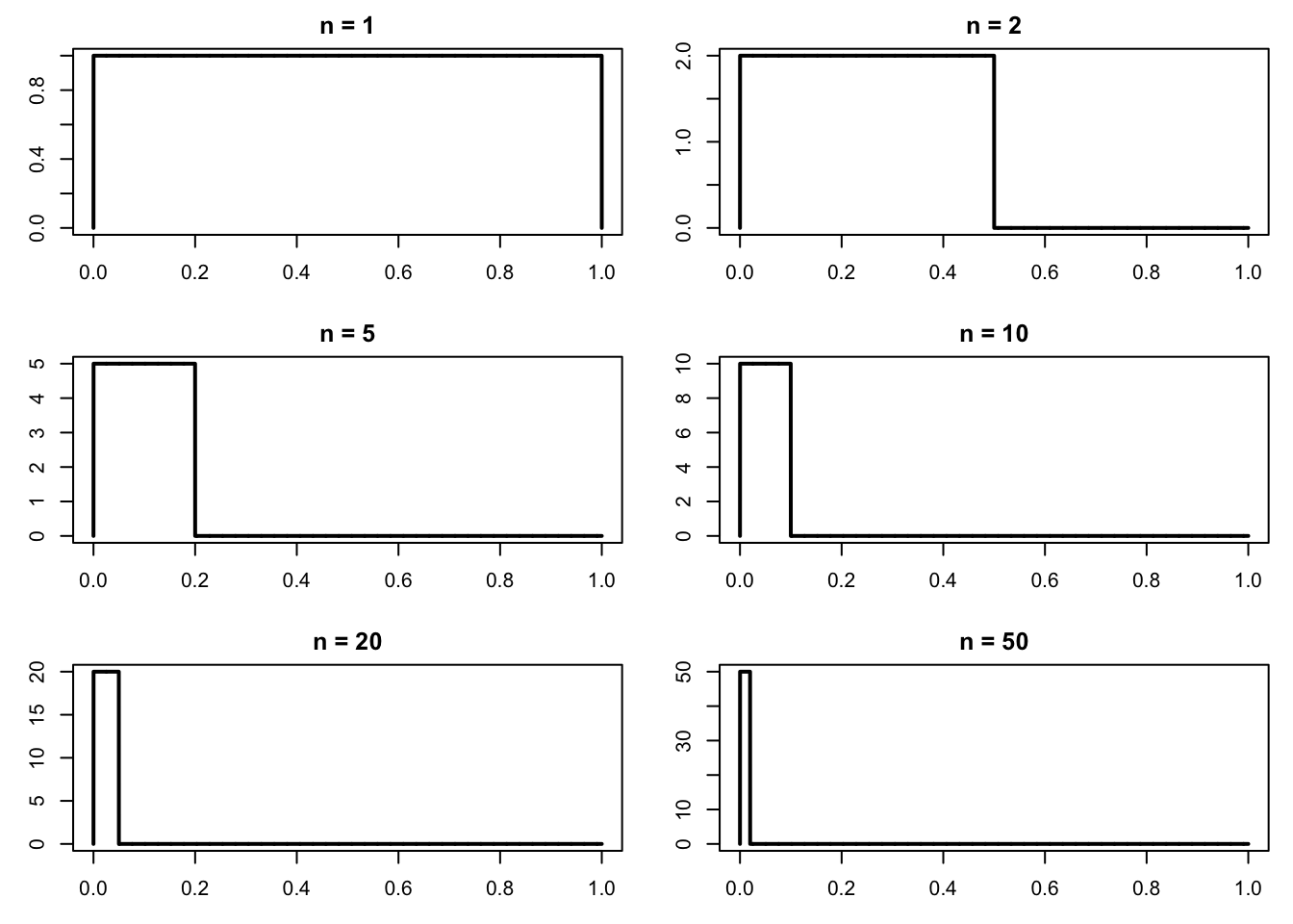 また,分布も一点 \(\frac1n\) に集中しているので,当然