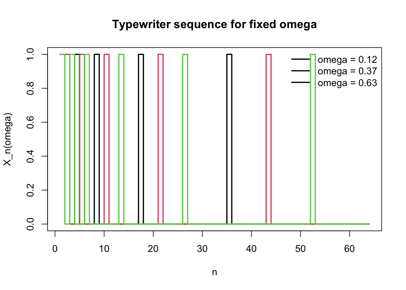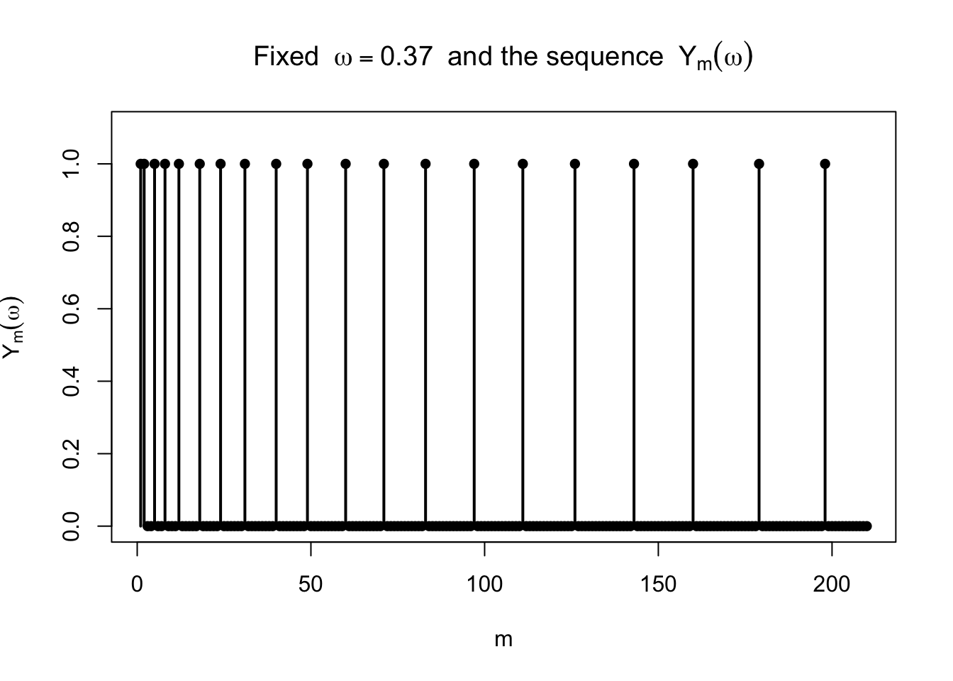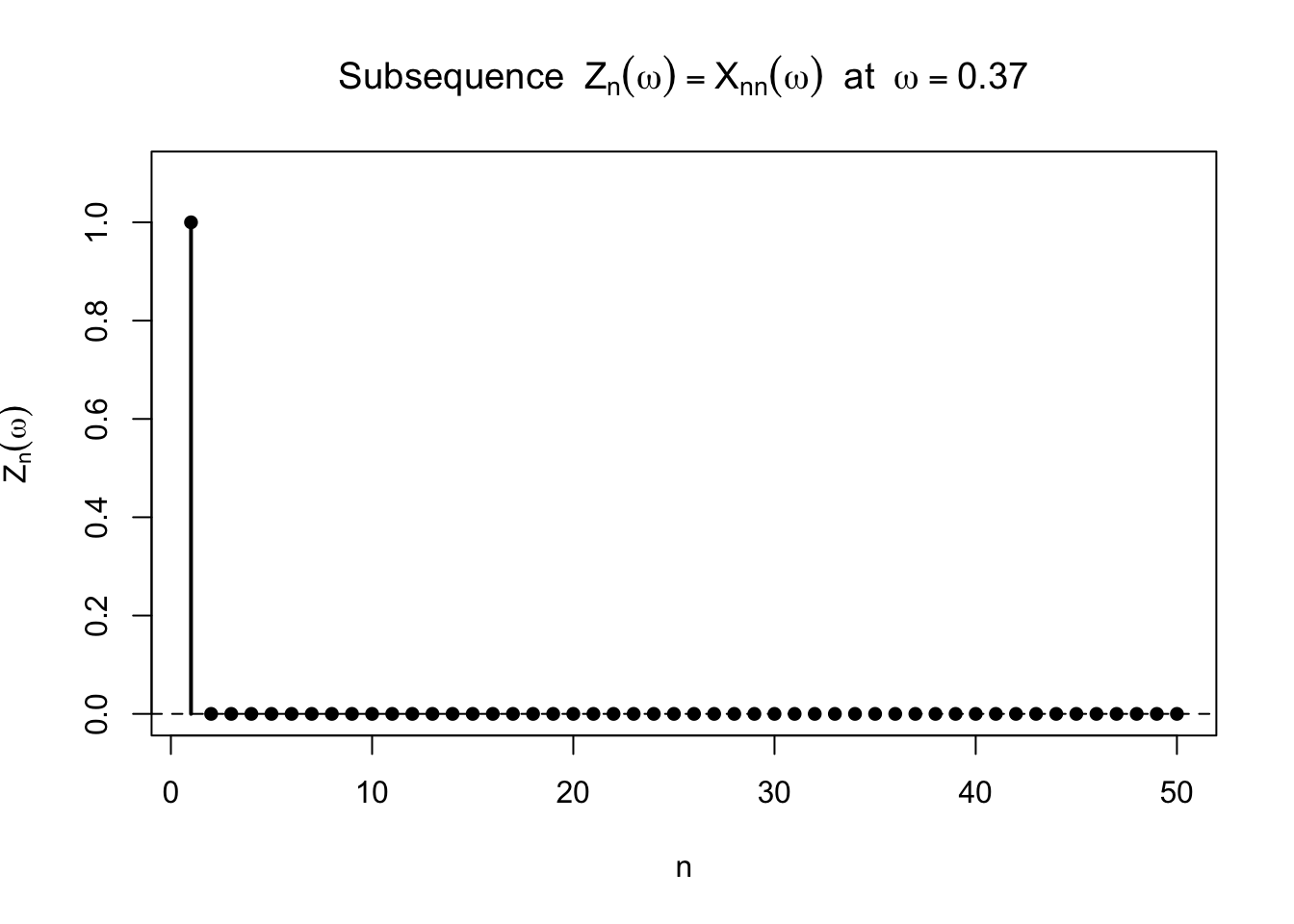 しかし各 \(\omega\in[0,1)\) を固定すると,\(X_n(\omega)\) は 1 にも 0 にも無限回なる。