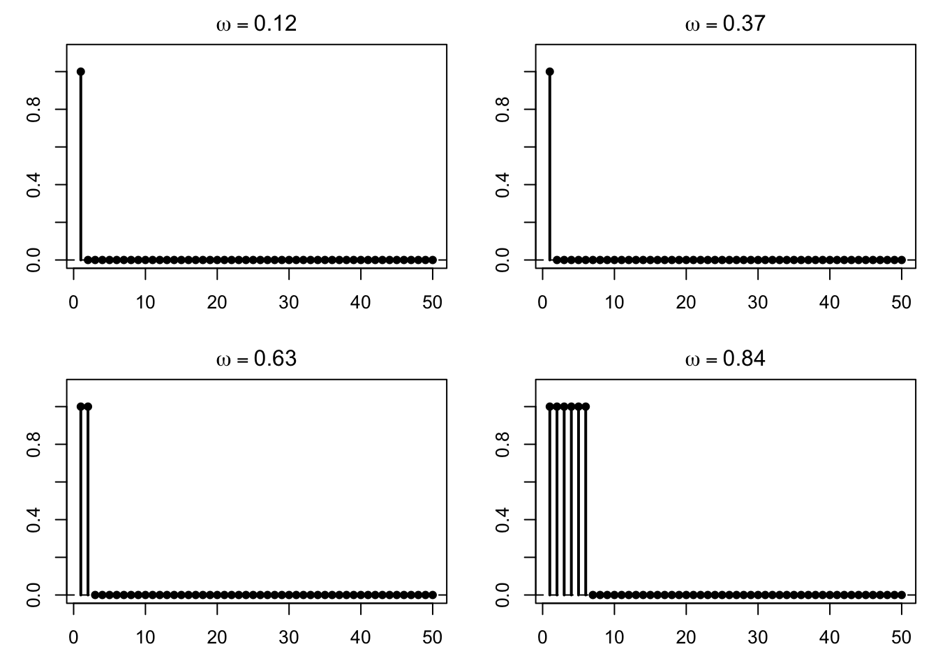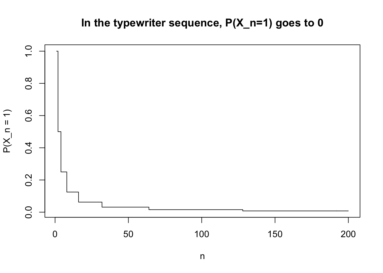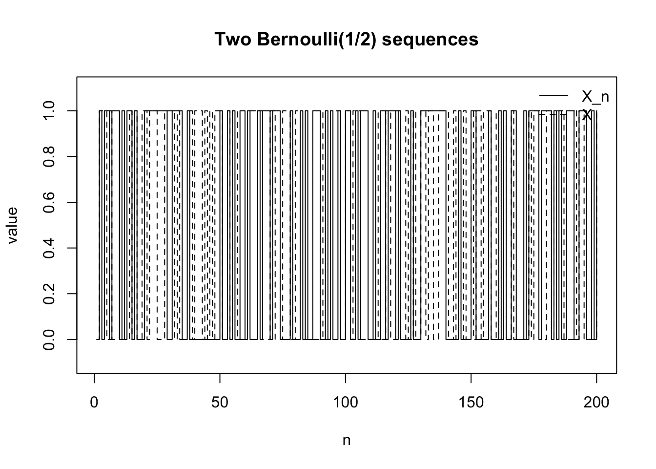 しかし各 \(\omega\in[0,1)\) を固定すると,\(X_n(\omega)\) は 1 にも 0 にも無限回なる。