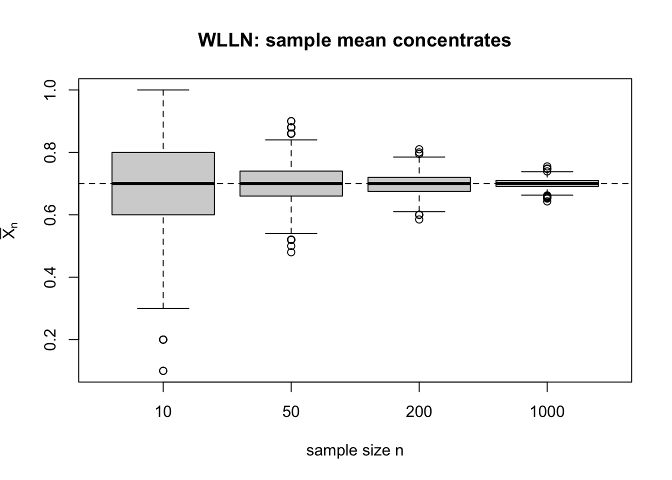 \(n\) が大きくなるほど箱が細くなり,\(\bar X_n\) が 0.7 の近くに集まっていく。