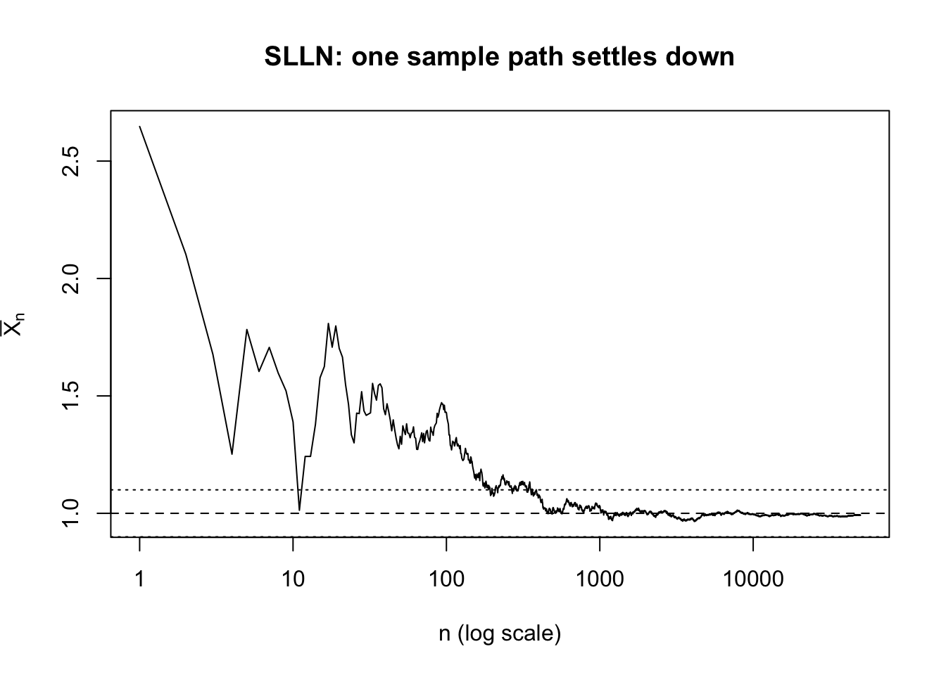 それでも,\(n\) が大きくなるにつれて曲線が母平均 1 の近くに張り付いていく様子は,SLLN の感覚そのものになっている。