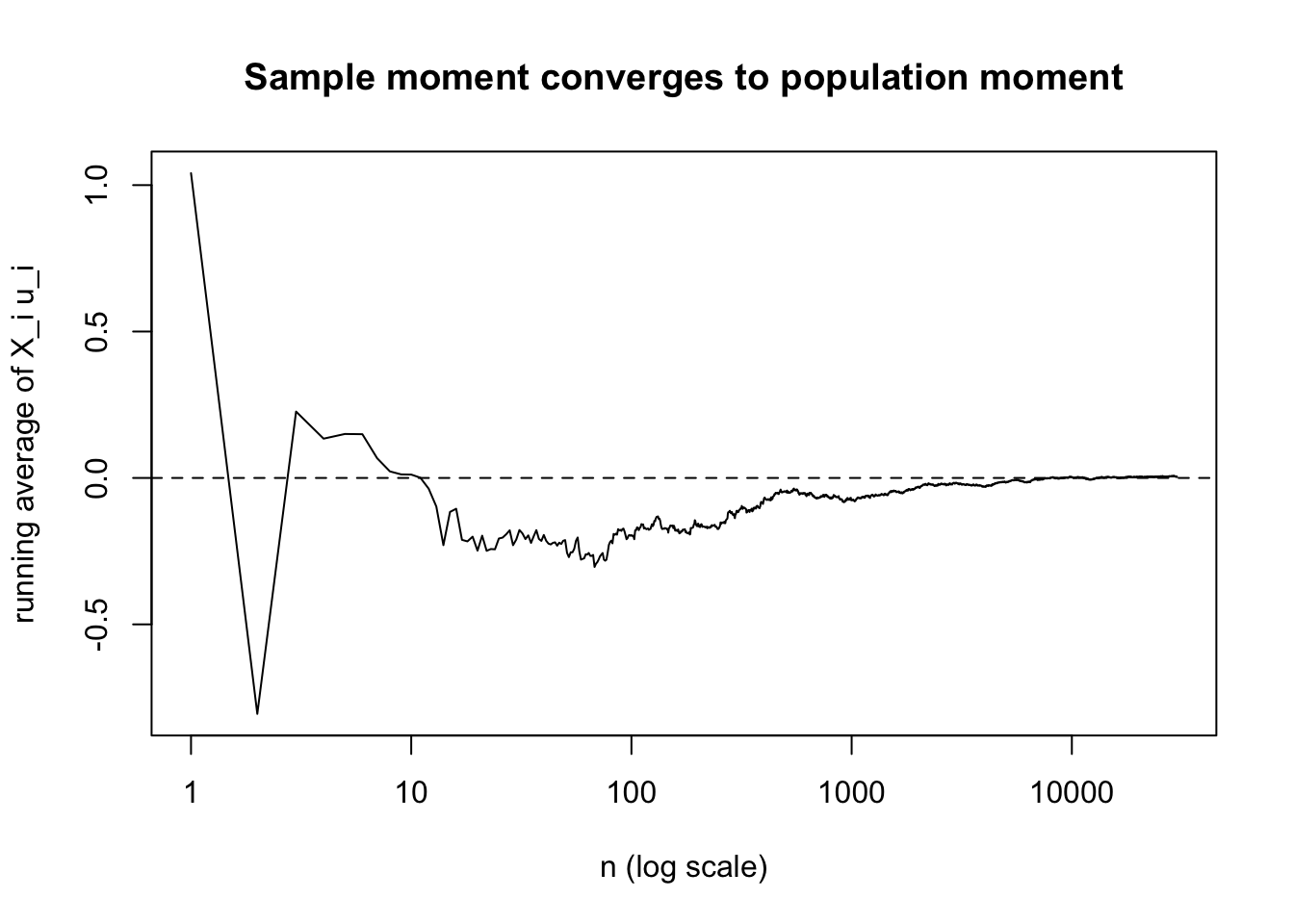 特に OLS や GMM の consistency では,母集団のモーメント条件 \[ E[X_i u_i]=0 \] を標本版 \[ \frac{1}{n}\sum_{i=1}^n X_i u_i \] に落としたい。