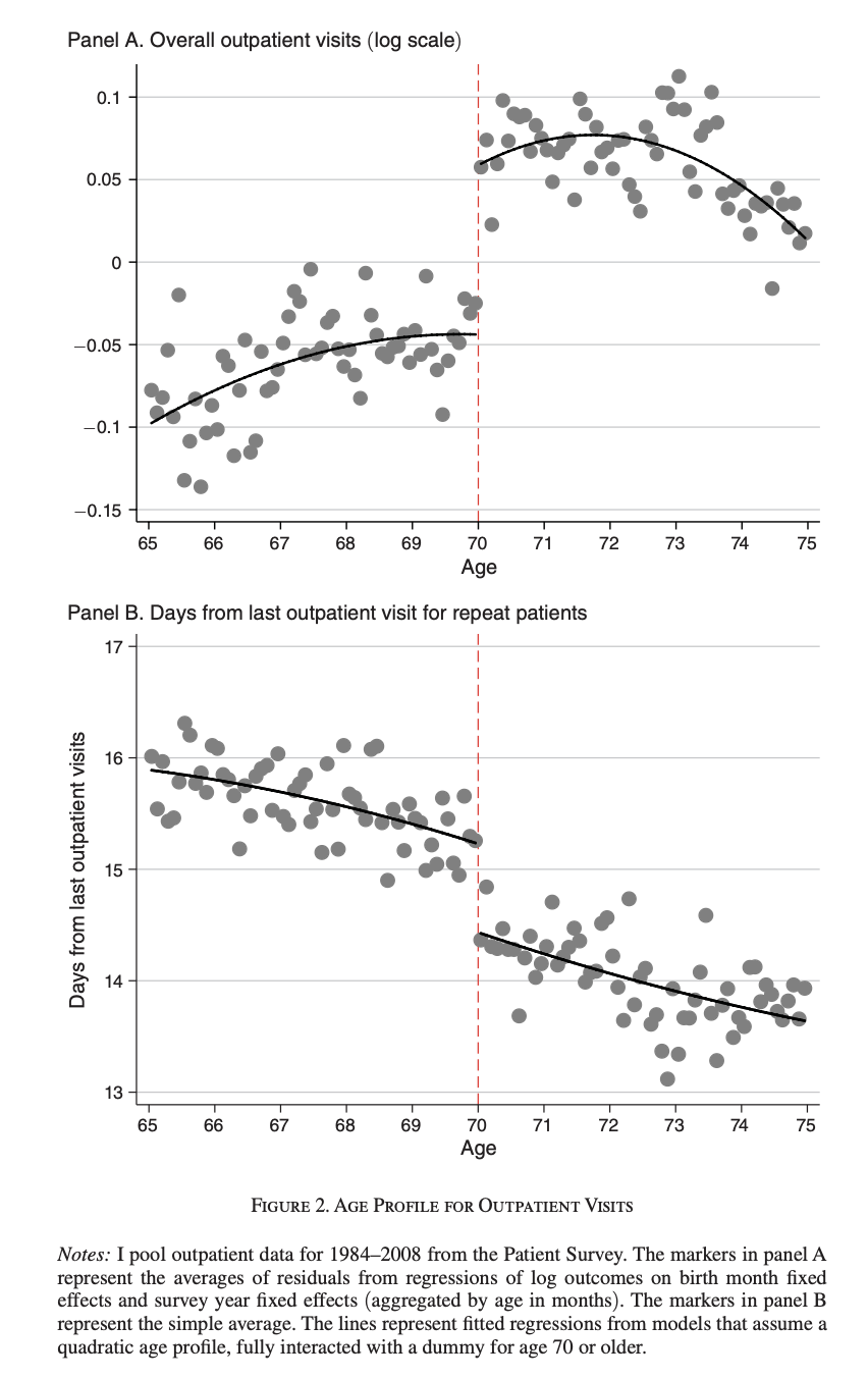 同じく Medicare の 65歳カットオフを使った論文で、こちらは主に医療利用への効果を見ている。