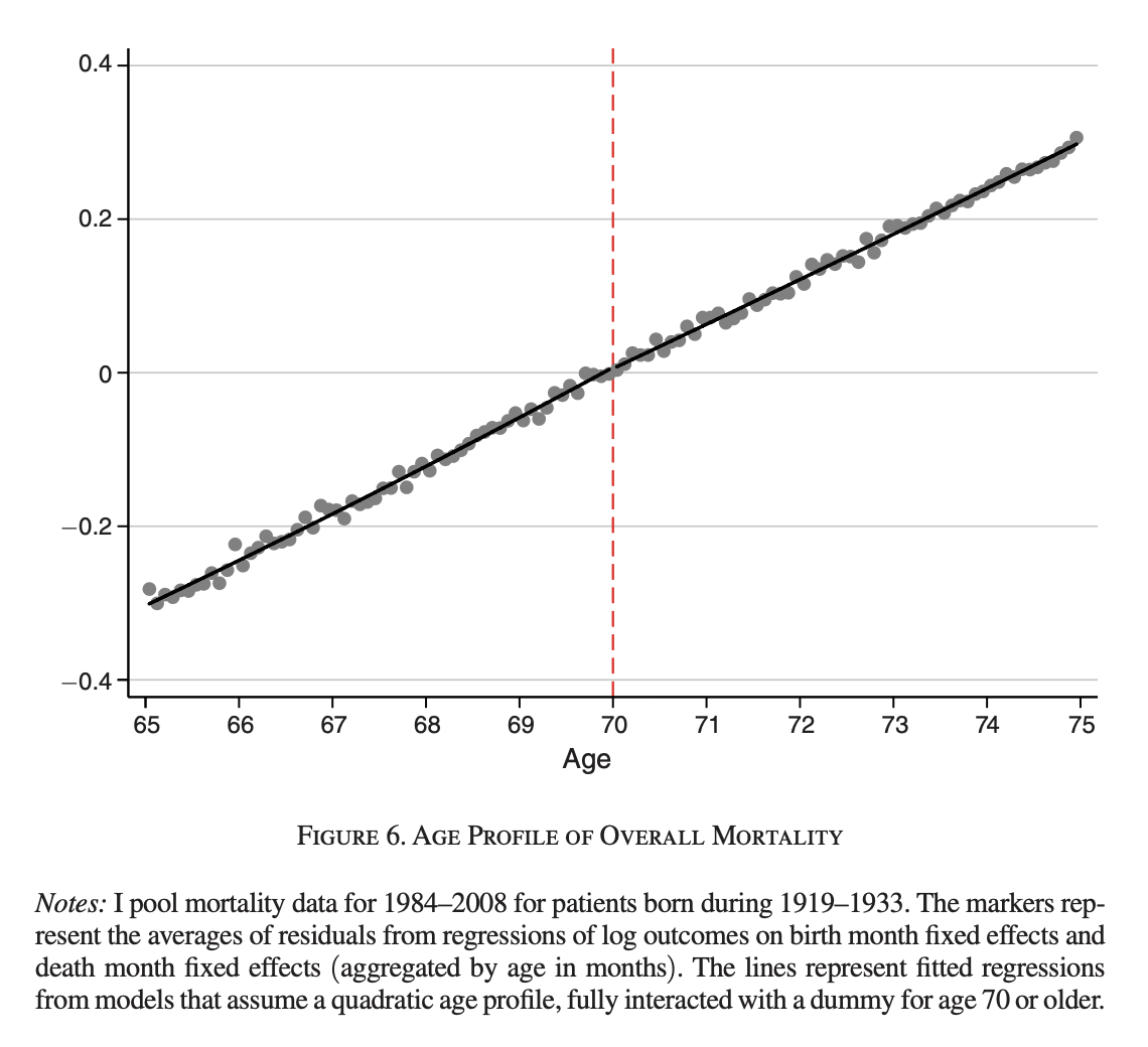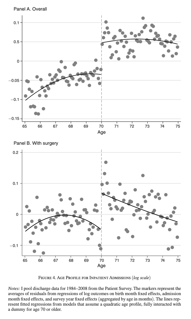 年齢RDDの代表例で、65歳で Medicare の適用が大きく変わることを利用している。