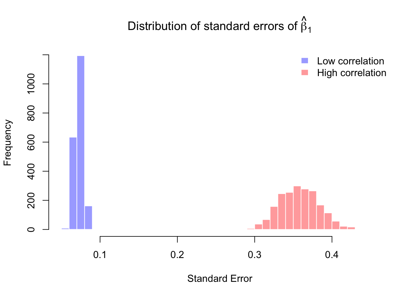 次に、相関が低いケースと高いケースで回帰を何度も繰り返し、\hat\beta_1 の分布を比べる。