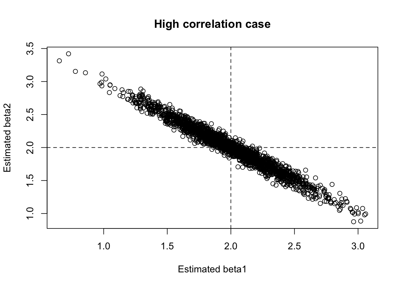 高相関のケースでは、\hat\beta_1 の分布がかなり広がるはずである。 真の値のまわりに中心はあるが、推定値のばらつきが大きい。