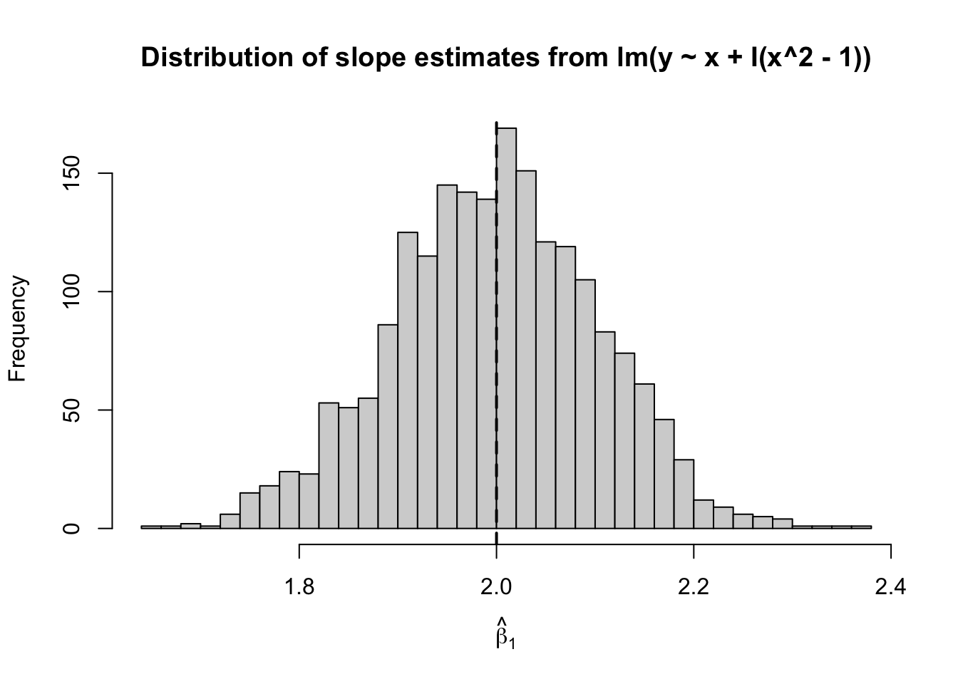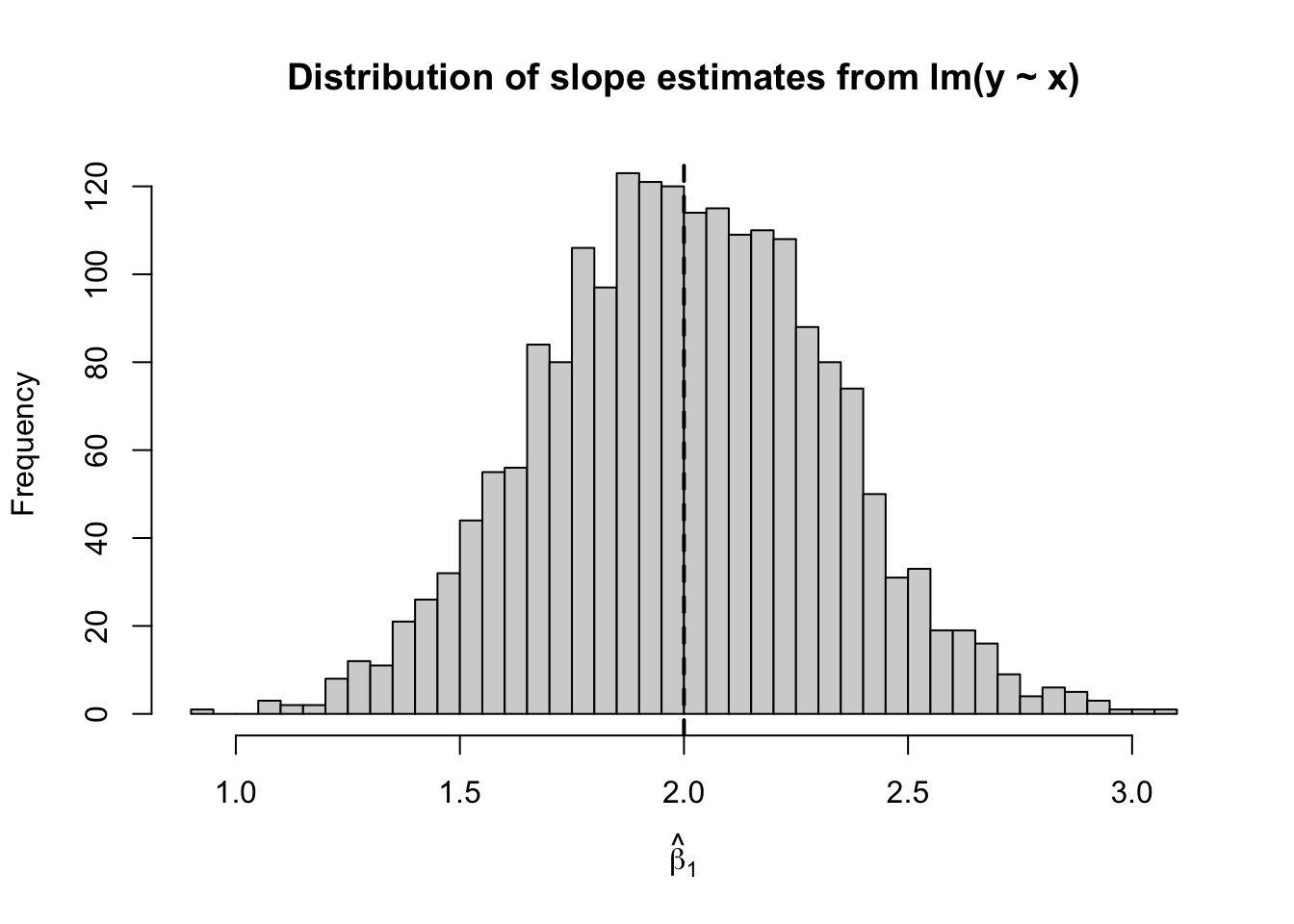 main = expression("Distribution of estimates of " * hat(beta)[1]),