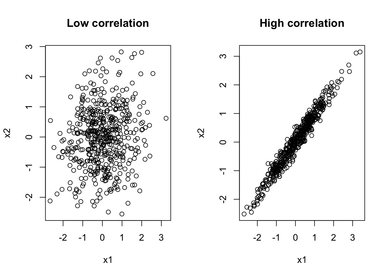 相関が低いときには、X_1 と X_2 はかなり独立に動いている。 一方、相関が高いときには、ほとんど一直線の上に点が並ぶ。 この場合、データは「X_1 だけが変わる」「X_2 だけが変わる」という variation をほとんど持たない。